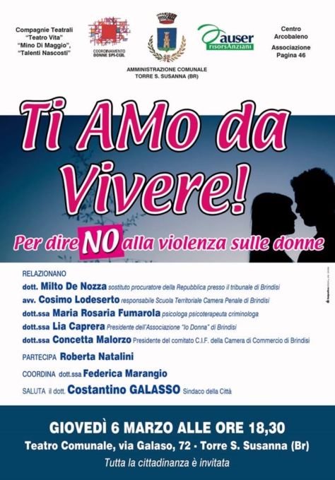 In occasione della Festa delle Donne, l'Assessorato alle Pari Opportunità di Torre Santa Susanna, il Coordinamento SPI-CGL e l'Associazione Auser in collaborazione con l’Associazione Pagina46 e le Compagnie Teatrali “Teatro e Vita”, “Mino Di Maggio” e “Talenti Nascosti” presentano giovedì 6 marzo alle ore 18.30 al teatro Comunale di Torre Santa Susanna l'evento "TI AMO DA VIVERE" un convegno-incontro di riflessione, cultura e spettacolo sulla violenza di genere.