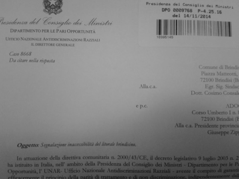 L’attività dell’ADOC provinciale di Brindisi posta in essere in questi anni al servizio dei cittadini ed in particolare delle fasce più bisognose della popolazione è stata attenzionata dalla Presidenza del Consiglio dei Ministri ed in particolare dal Dipartimento per le pari opportunità UNAR ( Ufficio Nazionale Antidiscriminazioni Razziali) con nota n. protocollo 4.25.16 del 14/11/2014. Nello specifico non sono sfuggite al dipartimento le continue segnalazioni/denunce che in questi anni la scrivente ha inoltrato alle istituzioni competenti in relazione alla diffusa presenza di barriere architettoniche negli spazi urbani oltre alla totale inaccessibiltà ad infrastrutture e luoghi pubblici per i diversamente abili. Tra le vertenze attenzionate quella relativa alla fruibilità del litorale nord di Brindisi che da anni, nonostante un’ordinanza balneare che ne ribadisce gli obblighi a carico della pubblica amministrazione, presenta limiti invalicabili per i soggetti più svantaggiati. L’argomento è oggetto della nota inviata al Sindaco di Brindisi al fine di ricevere notizie circa le attività poste in essere dall’attuale amministrazione utili al superamento di “ … tale situazione di perpetua inaccessibilità che costituisce una discriminazione ai sensi della L. 67/2006”. Nel corso dei contatti avuti con i funzionari ministeriali abbiamo avuto modo anche di fornire ulteriori informazioni circa altre criticità riscontrate nel Comune capoluogo. Dall’invalicabilità del sottopasso di Via Appia alla situazione del sottopasso pedonale di Via Tor Pisana che costringe i portatori di handicap a lunghe attese per la messa in funzione della pedana di sollevamento, sino alle ridotte dimensioni del marciapiede del cavalcavia De Gasperi, per arrivare alla dislocazione della segnaletica verticale al centro dei marciapiedi. Quelle elencate sono solo alcune delle criticità evidenziate attraverso documentazione fotografica e con atti prodotti dall’ADOC di Brindisi che saranno oggetto di ulteriori interventi da parte dell’UNAR. L’ADOC esprime soddisfazione per l’intervento registrato nella speranza che sia determinante ai fini del superamento delle problematiche evidenziate.Brindisi li, 21 Novembre 2014