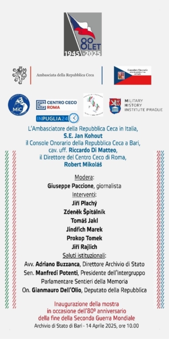 Si terrà lunedì 14 aprile alle ore 10.00, presso l’Archivio di Stato di Bari, l’inaugurazione della mostra organizzata in occasione dell’80° anniversario della fine della Seconda Guerra Mondiale, promossa dall’Ambasciata della Repubblica Ceca in Italia, dal Centro Ceco di Roma, dal Consolato Onorario della Repubblica Ceca in Puglia, dal Ministero della Cultura, e dal Military History Institute di Praga. Media partner la testata web IN PUGLIA 24