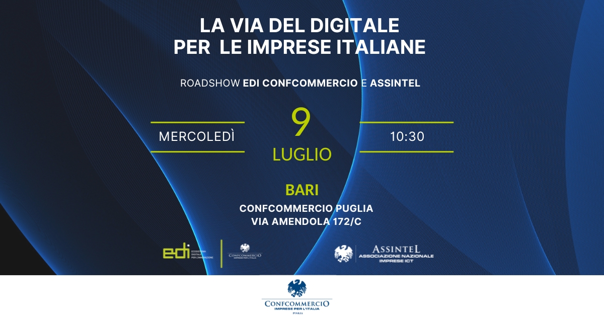 Durante l'incontro, approfondiremo i dati dell'Assintel Report sulle imprese pugliesi, i servizi per l'innovazione dalla voce di grandi corporate e il percorso pratico di EDI Confcommercio con i suoi sportelli SPIN, per aiutare le imprese a tradurre l'innovazione in azioni concrete.