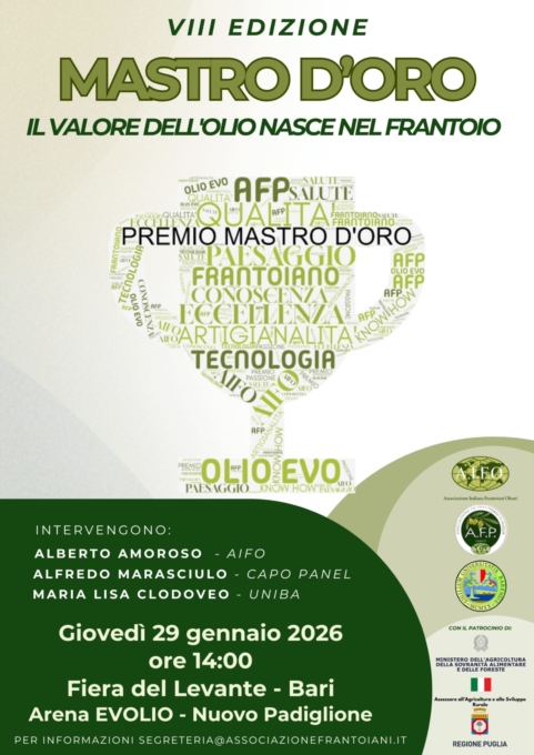 Nel pomeriggio dello stesso giorno, alle ore 14.00, presso l'Arena Evolio del Nuovo Padiglione, si terrà il convegno dal titolo "Il valore dell'olio nasce nel frantoio". L'incontro accompagnerà la premiazione del Concorso Mastro d'Oro 2026, giunto all'ottava edizione e unico concorso nazionale interamente dedicato ai frantoiani, che valuta l'olio extravergine di oliva come risultato diretto delle scelte tecnologiche e professionali adottate nella fase di trasformazione, e che ha ricevuto il patrocinio gratuito del Ministero dell'Agricoltura, della Sovranità Alimentare e delle Foreste e il patrocinio gratuito dell'Assessore all'Agricoltura e allo Sviluppo Rurale della Regione Puglia. Interverranno Alberto Amoroso, presidente di AIFO, Alfredo Marasciulo, capo panel del Concorso Mastro d'Oro, e Maria Lisa Clodoveo, docente dell'Università degli Studi di Bari, con un approfondimento sul ruolo del frantoiano nella creazione di valore, nella qualità e nella competitività dell'olio sul mercato.