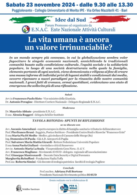 Si terrà Sabato 23 Novembre a Bari, presso il Collegio Universitario di Merito IPE Poggiolevante, ,via Orfeo Mazzitelli 41, il Forum culturale Idee dal Sud.Il Forum è promosso ed organizzato da ENAC - Ente Nazionale Attività Culturali con la collaborazione di IO SUD - Segreteria Regionale Puglia, dallo Schiller Institute e da Gens Nova.O.d.VL'evento culturale che avrà luogo nel capoluogo pugliese si propone di fornire delle risposte concrete alla spinosa domanda del nostro tempo: La vita Umana è ancora un valore irrinunciabile? In un mondo dove la globalizzazione ha ormai prevaricato ogni buon senso e ha completamente distrutto quell'interessenza che univa i popoli della terra, arrivando sinanco a minare le fondamenta dell'impianto sociale più importante al mondo, la famiglia, ha ulteriormente aggredito e vandalizzato il concetto più sublime quello della vita che oggi pare non abbia più valore.