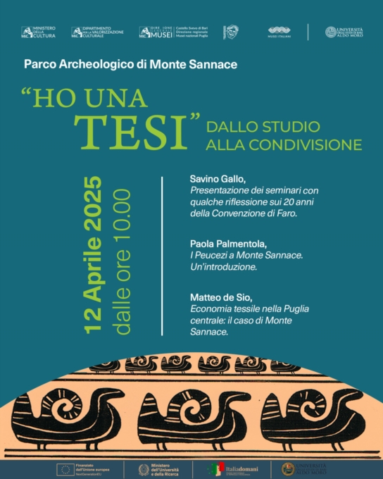 Si chiama "Ho una tesi. Dallo studio alla condivisione" il ciclo di incontri che si terrà presso il Parco archeologico di Monte Sannace, pensato per rendere il dibattito archeologico un momento di confronto e un catalizzatore per lo sviluppo della locale comunità d'eredità. Il patrimonio archeologico di Monte Sannace, dopo essere stato portato in luce e studiato, rischierebbe di rimanere a disposizione di una ristretta cerchia di specialisti. Con un approccio diretto e accessibile, le nuove conoscenze sull'insediamento di Monte Sannace/Thuriae tornano così alle comunità locali, a chiudere una filiera culturale che rafforza l'intero territorio di riferimento.