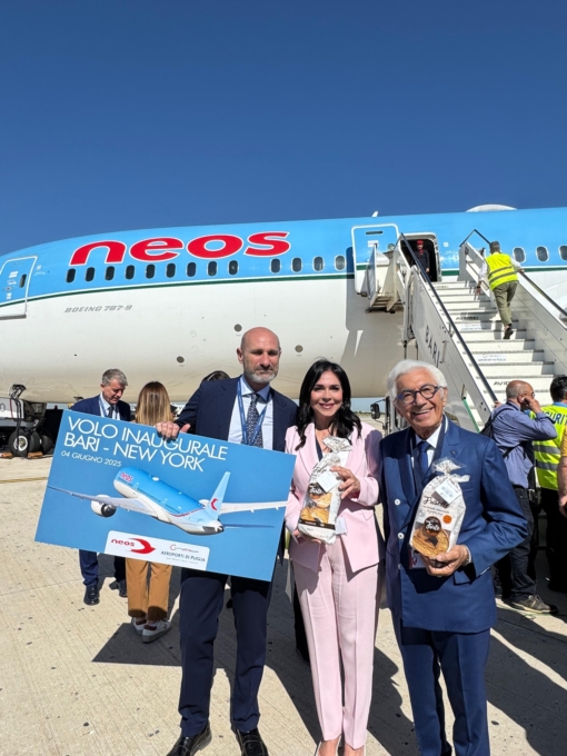 È atterrato questa mattina alle ore 9:00 all'aeroporto "Karol Wojtyla" di Bari-Palese il primo volo Neos dall'aeroporto JFK di New York. La nuova tratta, attiva fino al 15 ottobre 2025, sarà operata una volta la settimana con un Boeing 787-9 Dreamliner configurato con due classi di servizio (Premium ed Economy) e dotato di un totale di 355 posti. L'aereo partirà da New York ogni martedì alle ore 18:20 (ora locale) e atterrerà a Bari il mercoledì alle ore 9:00, da dove ripartirà lo stesso giorno alle 11:35, con arrivo a New York alle 14:50.All'arrivo, i passeggeri sono stati accolti con un benvenuto speciale: le "Friselle Classiche" a marchio Forte, simbolo della tradizione pugliese e del forte legame dell'azienda con il suo territorio di appartenenza. Sono infatti prodotte con semola rimacinata 100% grano duro pugliese e lievito madre da Oropan di Altamura, oggi azienda leader settore della panificazione e ambasciatrice del Made in Italy nel mondo.