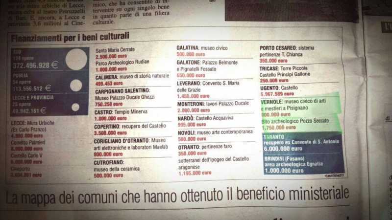 Beni Culturali : Lecce 28 milioni, Brindisi non pervenuta.