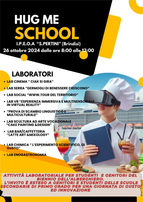 Giornate festive di orientamento alla scelta scolastica prendono il via nella formula dell’Aperitivo a Scuola – “AperiOrienta ” – nell’ istituto Sandro Pertini di Brindisi del D.S. Cosimo Marcello Castellano. Studenti e genitori delle scuole secondarie di primo grado saranno accolti per attività di orientamento a partire da sabato 26 ottobre - dalle ore 9.00 alle ore 13.00- con servizio conviviale di Caffetteria e Aperitivo. Occasioni di incontro sono programmate nei giorni di:Domenica 17/11/2024 9.00 -13.00