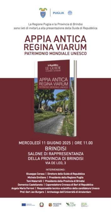 Sarà il Salone di Rappresentanza della Provincia di Brindisi a ospitare la presentazione della Guida di Repubblica "Appia Antica, Regina Viarum: Patrimonio Mondiale dell'Unesco". Il volume, disponibile in edicola (12,00 euro più il prezzo del quotidiano) e online su https://repubblicabookshop.it/APPIA-ANTICA-REGINA-VIARUM.-PATRIMONIO-MONDIALE-UNESCO/003888250414, sarà protagonista dalle ore 11 in via De Leo 3.