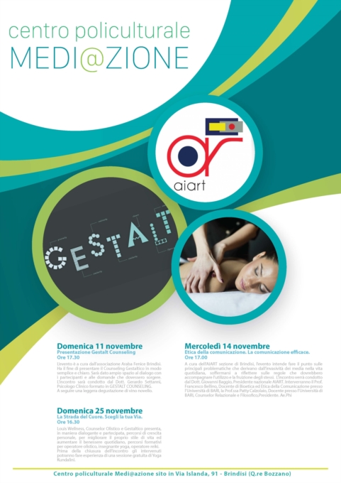 L’evento è a cura dall’associazione ARABA FENICE BRINDISI. Ha il fine di presentare il Counseling Gestaltico in modo semplice e chiaro. Sarà dato ampio spazio al dialogo con i partecipanti e alle domande che dovessero sorgere. L'incontro sarà condotto dal Dott. Gerardo Settanni, Psicologo Clinico formato in GESTALT COUNSELING. Dopo l’incontro ci sarà una breve degustazione di vino novello.