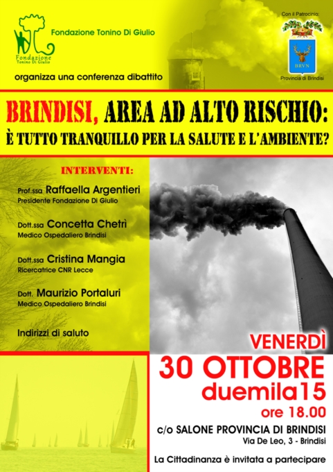 La Fondazione Tonino Di Giulio con il Patrocinio della Provincia di Brindisi, ha organizzato una Conferenza –Dibattito, Venerdi’ 30 Ottobre 2015, alle ore 18.00 presso il Salone della Provincia di Brindisi (Via De Leo, 3 ) sul tema “ BRINDISI, AREA AD ALTO RISCHIO : E’ TUTTO TRANQUILLO PER LA SALUTE E L’AMBIENTE? “Interverranno: