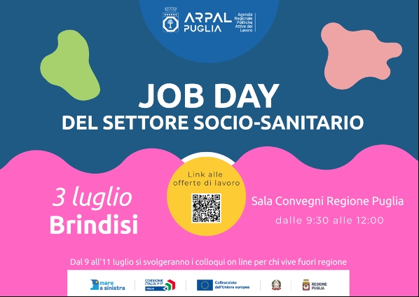 In programma invece per giovedì 3 luglio, dalle 9:30 alle 12:00, la seconda tappa del JOB DAY in ambito socio-sanitario che avrà luogo presso il Centro per l’impiego di Brindisi, Sala Convegni del Palazzo della Regione Puglia. L’evento, progettato nell’ambito delle attività del ‘servizio incrocio domanda-offerta’, è finalizzato ad intercettare uno specifico fabbisogno del territorio, coinvolgendo molteplici aziende del settore, offrendo al contempo un’opportunità a coloro i quali vorrebbero trovare un’occupazione nell’ambito socio-sanitario.