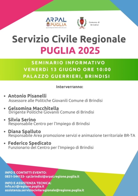 Il comune di Brindisi in tal senso offre un’importante tappa conoscitiva per chi vorrà scoprire nei dettagli tutte le informazioni e gli adempimenti utili all’adesione al progetto legato al Servizio Civile Regionale. L’incontro pubblico è previsto il 13 giugno 2025 alle ore 10:00, presso gli spazi di Palazzo Guerrieri a Brindisi.