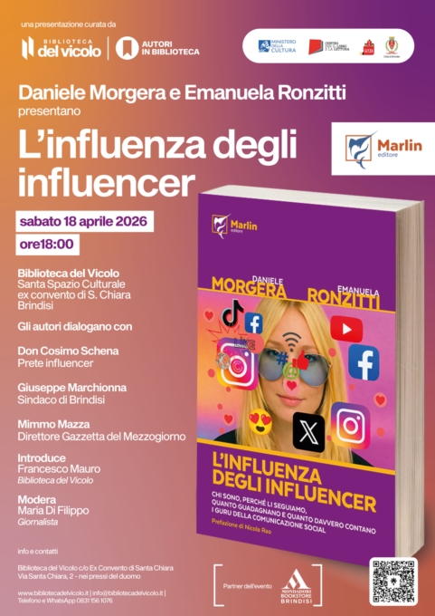 Sabato 18 aprile 2026 alle ore 18:00, si terrà la presentazione del libro "L'influenza degli influencer" dei giornalisti Rai, Daniele Morgera ed Emanuela Ronzitti, edito da Marlin Editore, un'opera che analizza in maniera critica e accessibile il ruolo degli influencer nella società contemporanea, interrogandosi su identità, consenso, economia e impatto culturale dei nuovi protagonisti della comunicazione digitale.