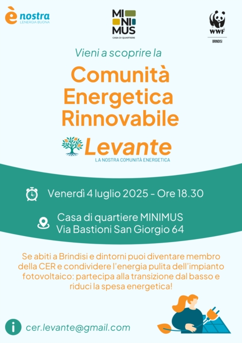 Venerdì 4 luglio alle 18.30 presso la Casa di Quartiere MINIMUS (Via Bastioni San Giorgio 64, Brindisi) si terrà l'evento di lancio della Comunità Energetica Rinnovabile CER Levante, aperto a tutta la cittadinanza. Alimentata dall'impianto fotovoltaico collettivo da 843,6 kWp realizzato dalla cooperativa energetica ènostra, la CER Levante si apre a cittadini, associazioni, PMI che entrando a far parte della comunità come soci consumatori potrebbero condividere l'energia solare e contribuire a generare incentivi economici.