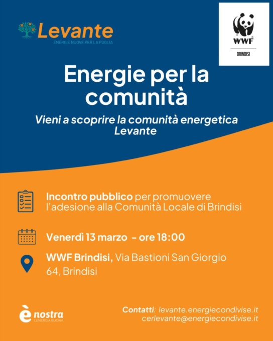 Prosegue il percorso di coinvolgimento della cittadinanza promosso dalla Comunità Energetica Levante. Venerdì 13 marzo si terrà un nuovo incontro pubblico dedicato alla scoperta e all'approfondimento della CER (Comunità Energetica Rinnovabile), una realtà nata a Brindisi, nell’aprile dello scorso anno, dalla collaborazione della cooperativa ènostra e WWF Brindisi e che sta già estendendo le proprie radici nel territorio pugliese con le sedi di Crispiano, Noci e Trani.In un territorio caratterizzato da una forte presenza di sole, vento e mare, la costituzione di una comunità energetica rappresenta una risposta concreta per coniugare sostenibilità, giustizia sociale e tutela del territorio.