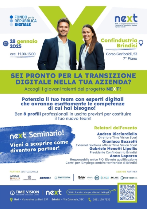 CONFINDUSTRIA BRINDISI organizza un incontro-seminario su NEXT; FONDO PER LA TRANSIZIONE DIGITALE Martedì 28 Gennaio dalle 11 alle 13 presso la sede di CONFININDUSTRIA BRINDISI in Corso Garibaldi 53.Relatori dell'evento