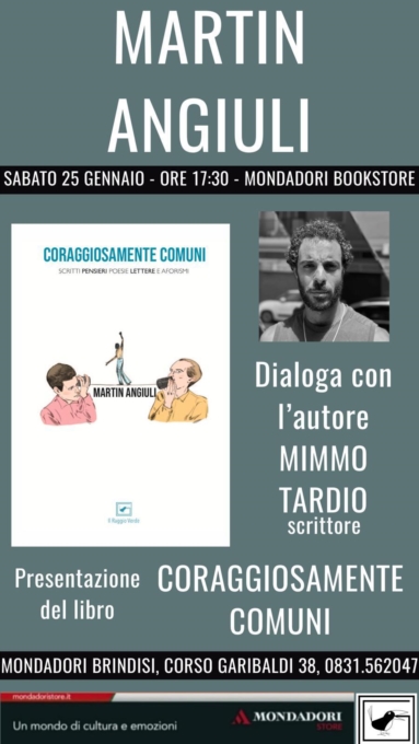 “Coraggiosamente Comuni”: il nuovo libro di Martin Angiuli si presenta a Lecce e Brindisi.Si terranno oggi, 24 gennaio a Lecce, presso la Biblioteca Bernardini, e domani 25 gennaio a Brindisi, alla Libreria Mondadori Bookstore in Corso Garibaldi, le presentazioni ufficiali di Coraggiosamente Comuni, il nuovo libro di Martin Angiuli, pubblicato da Il Raggio Verde (240 pagine, prezzo di copertina 18 euro).
