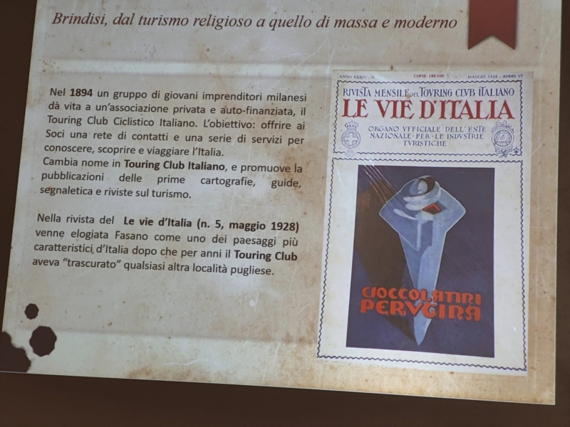 Venerdì 8 novembre 2024, in occasione dei 130 anni dalla fondazione del Touring Club Italiano (1894 – 2024) e del decennale della attivazione del programma nazionale di “Aperti per Voi “ in Brindisi, il locale Club del Territorio del TCI, alla presenza dei referenti locali, Consoli Angelo Espinosa e Maria Lasaponara, della Console regionale del TCI Luciana Doronzo e della referente per i Beni Monumentali e del Turismo del comune di Brindisi, Dott.ssa Antonella Grassi, iscritti, volontari, simpatizzanti hanno partecipato alla conferenza sulla “Evoluzione del turismo a Brindisi nei secoli, da turismo religioso a turismo di massa e moderno”. La conferenza è stata svolta dal Dott. Giovanni Membola, giornalista pubblicista ed esperto di storia locale alla presenza di un folto interessato uditorio nella suggestiva e splendida cornice della Casa Minimus di quartiere, presso i Bastioni Carlo V, messa a disposizione per l’occasione dal responsabile provinciale WWF, Prof. Antonio Frascino ha intratterrà i presenti con riflessioni sulla storia di viaggi e di turismo degli ultimi 130 anni.