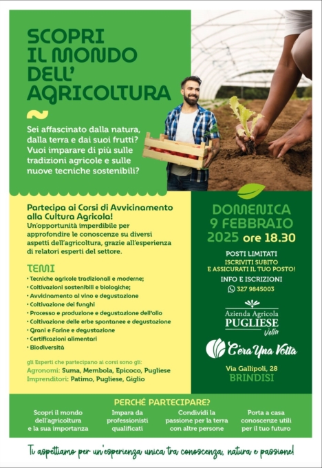 L'Azienda agricola della famiglia di Vincenzo Pugliese ha organizzato una serie di appuntamenti di "avvicinamento alla cultura agricola". Un'opportunità imperdibile per approfondire le conoscenze su diversi aspetti dell'agricoltura, grazie all'esperienza di relatori esperti del settore. Il primo appuntamento è per domenica 9 febbraio, alle ore 18.30, presso il bistrot di famiglia "Ceraunavoltashop" sito in Via Gallipoli 28. A relazionare, oltre ai padroni di casa, Vincenzo e Velia Pugliese, gli agronomi Felice Suma e Antonella Epicoco. Tanti i temi che saranno trattati negli appuntamenti dedicati alla "cultura agricola": dalle tecniche agricole tradizionali e moderne; alle coltivazioni sostenibili e biologiche; dall'avvicinamento al vino con degustazione; la coltivazione dei funghi; il processo di produzione e degustazione dell'olio; la coltivazione delle erbe spontanee con degustazione; i grani, le farine con degustazione; le certificazioni alimentari e la biodiversità. Trai relatori, Teodoro Membola, Francesco Soleti, Nicola Panaro, Leonardo Patimo, Gilda Giglio, Carlo Cagnazzo e Gianpaolo Amatori Sarà un'occasione per i tanti appassionati di scoprire il mondo dell'agricoltura e la sua importanza; imparare da professionisti qualificati; condividere la passione per la terra con altre persone e portare a casa conoscenze utili per il proprio futuro. I posti sono limitati e gratuiti. Per iscrizioni e informazioni basta telefonare al 327/9845003Ricerca