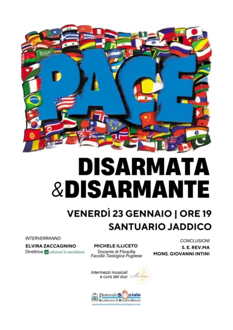 Venerdì 23 gennaio 2026, alle ore 19.00, presso il Santuario di Jaddico (Brindisi), si terrà l'incontro pubblico di riflessione dal titolo "Pace disarmata e disarmante", un momento di approfondimento e dialogo sui temi della pace, della nonviolenza e della responsabilità educativa nella complessità del tempo presente.