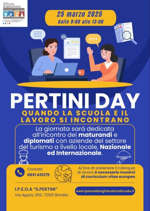 DOMANI Martedì 25 marzo presso l’IPEOA Pertini di Brindisi a partire dalle ore 9.00 alle ore 13.30 si svolgerà la settima edizione del recruiting day dal titolo “PERTINI DAY: QUANDO LA SCUOLA E IL LAVORO SI INCONTRANO”. L’Istituto Alberghiero Pertini ospiterà ARPAL Puglia, ITS Academy Turismo Puglia, ITS Academy Agroalimentare, Università di Bari, Rete Impresa Hub, Associazioni di categoria del Settore (FIC – Federazione Italiana Cuochi, Federalberghi, ADA - Associazione Direttori di Alberghi, Confindustria Brindisi sezione Turismo, Confcommercio) e oltre 20 aziende del settore turistico ed enogastronomico, al fine di promuovere il permanente raccordo con il mondo del lavoro e la formazione terziaria. Gli incontri di selezione e orientamento saranno rivolti agli studenti del triennio, oltre che ai diplomati IPEOA Pertini. Di seguito si riportano alcune delle aziende che saranno presenti: Obiettivo Tropici, Alpitour Voi Hotels, FV Futura, Blu Hotels, CDS Hotels Group, Gruppo Puglia Holiday, Tenuta Moreno, Masseria Santa Lucia, Hotel Orientale, Executive Inn, Garibaldi Hotel, Mondo Tondo Villaggi, Consorzio Albergatori Carovigno.