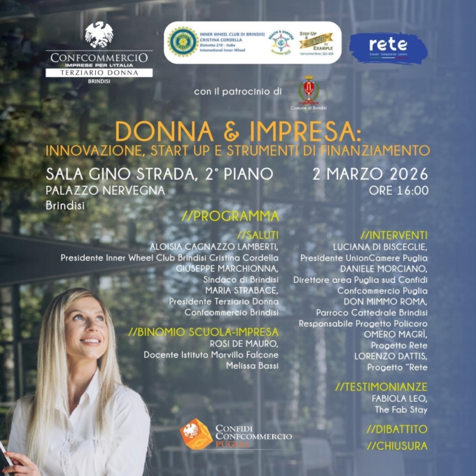 "Donna e Impresa – Innovazione, start up e strumenti di finanziamento" – Iniziativa a Brindisi Inner Wheel "Cristina Cordella", di Terziario Donna/Confcommercio e "Rete"Lunedì 2 marzo, alle ore 16.00, a Brindisi, nella Sala Gino Strada di Palazzo Nervegna, si svolgerà un convegno sul tema "Donna e Impresa – Innovazione, start up e strumenti di finanziamento". Si tratta di una iniziativa di Inner Wheel "Cristina Cordella", Terziario Donna/Confcommercio Brindisi e "Rete", con il patrocinio del Comune di Brindisi.