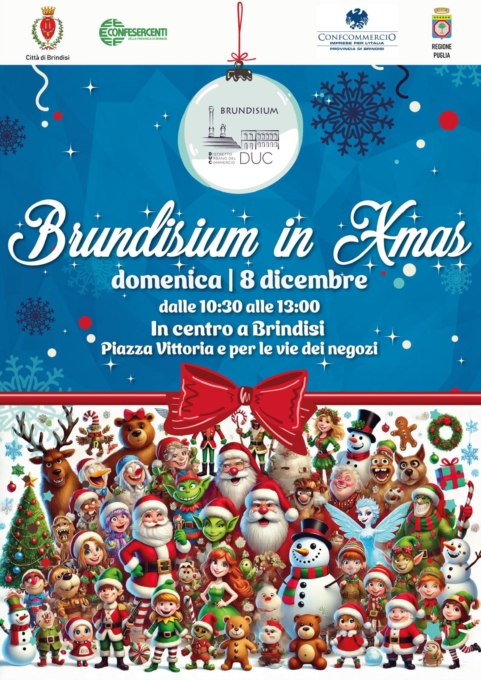 BRUNDISIUM IN XMAS – 8 DICEMBRE - EVENTO DI NATALE PROMOSSO DAL DISTRETTO URBANO DEL COMMERCIO DI BRINDISINella mattinata dell’8 dicembre, il Centro prenderà vita animandosi con i mille colori del Natale, evento promosso dal Distretto Urbano del Commercio di Brindisi, una rete di intenti finalizzati alla rivitalizzazione del centro urbano che vede partecipi, con il supporto della Regione Puglia, il Comune di Brindisi e le associazioni di categoria Confesercenti e Confcommercio.