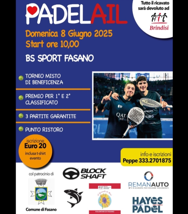 BRINDISI. FASANO : PADELAIL 2025: SOLIDARIETA' IN FAVORE DELL'AIL