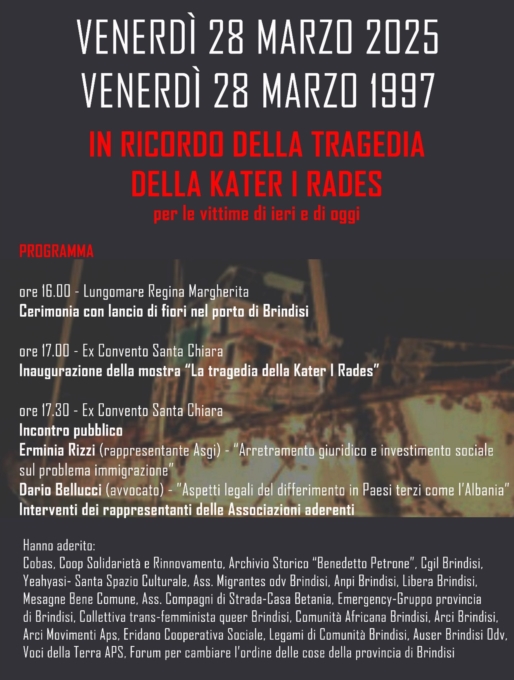 Pertanto, il programma della giornata di venerdì 28 marzo prevede alle ore 16.00, presso il lungomare Regina Margherita, la cerimonia con lancio di fiori nel porto di Brindisi in ricordo delle vittime; alle 17.00, presso l’ex convento Santa Chiara ci sarà l’inaugurazione di una mostra dedicata alla tragedia della Kater I Rades, con foto e pannelli che ricostruiscono quel Venerdì Santo di 28 anni fa e a seguire alle 17.30 un incontro pubblico sui temi dell’accoglienza. All’incontro prenderanno parte Erminia Rizzi, rappresentante Asgi (Associazione studi giuridici italiani), su Arretramento giuridico e investimento sociale sul problema dell’immigrazione e l’avvocato Dario Bellucci su Aspetti legali del differimento in Paesi terzi come l’Albania. Seguiranno alcuni interventi dei rappresentanti delle associazioni che hanno aderito all’iniziativa: Cobas, Coop Solidarietà e Rinnovamento, Archivio Storico “Benedetto Petrone”, Cgil Brindisi, Yeahyasi- Santa Spazio Culturale, Ass. Migrantes odv Brindisi, Anpi Brindisi, Libera Brindisi, Mesagne Bene Comune, Ass. Compagni di Strada-Casa Betania, Emergency-Gruppo provincia di Brindisi, Collettiva trans-femminista queer Brindisi, Comunità Africana Brindisi, Arci Brindisi, Arci Movimenti Aps, Arci Lecce Solidarietà, Eridano Cooperativa Sociale, Legami di Comunità Brindisi, Auser Brindisi Odv, Voci della Terra APS, Forum per cambiare l’ordine delle cose della provincia di Brindisi.