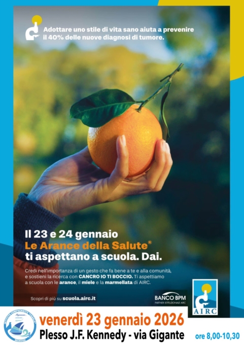 Venerdì 23 Gennaio pv dalle ore 8,00 alle ore 10,30 presso il plesso “Kennedy”, in via Gigante, al rione Casale, sarà possibile trovare ragazzi, docenti e genitori impegnati nella vendita e distribuzione delle "Arance della salute", delle marmellate e del miele. Il ricavato della raccolta finanzierà la migliore ricerca sul cancro e i ragazzi impegnati in un'esperienza di volontariato scopriranno l'importanza di una cittadinanza attiva e il valore della ricerca scientifica.