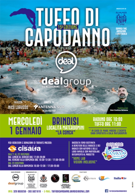 Il "TUFFO DI CAPODANNO" che può contare su un gruppo ha permesso alla città di Brindisi di collocarsi di diritto tra le città mondiali che festeggiano eccentricamente il primo giorno dell'anno nuovo, una tra le poche a prevedere in ogni edizione la raccolta fondi da devolvere ad un progetto sociale. Un modo alternativo di festeggiare il capodanno, aperto a tutta la cittadinanza e spettacolo unico ed imperdibile per quanti vi assistono come spettatori. Per chi non potrà raggiungere la Conca, potrà seguire la Diretta Tv sull'emittente Antenna Sud, media partner dell'evento per il 7° anno consecutivo.