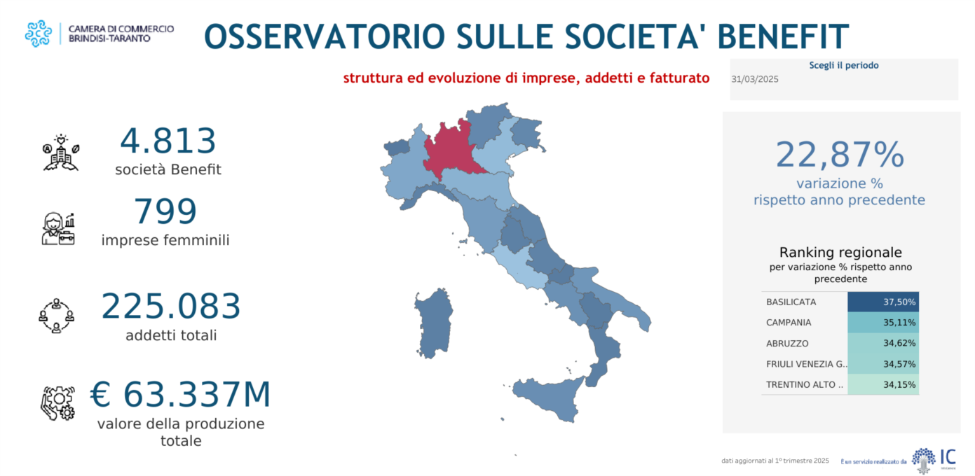 Rilasciati da Camera di commercio Brindisi – Taranto e Infocamere i dati relativi al I trimestre 2025Sono 4.813 le società benefit italiane al 31 marzo 2025, con una crescita del 23% rispetto all'anno precedente. Un ottimo risultato, se si considera che il primo trimestre dell'anno è sempre quello in cui il sistema risente delle chiusure di fine anno. Il quadro emerge dall'ultimo rilascio dell'Osservatorio sulle Società Benefit tenuto dalla Camera di commercio di Brindisi - Taranto e InfoCamere, attivo dal 2017 e gestito dal 2022 attraverso una dashboard di analisi evoluta del dato.