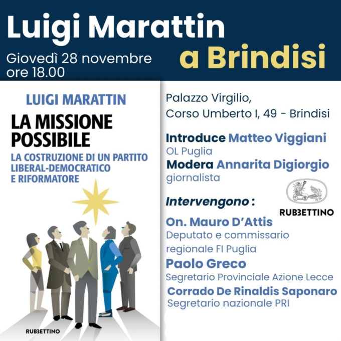Si svolgerà il prossimo giovedì 28 novembre alle ore 18:00 presso l’hotel Palazzo Virgilio a Brindisi, la presentazione del libro “La Missione Possibile”, Rubbettino Editore, dell’On. Luigi Marattin, nel quale delineano i contorni di un'offerta politica liberal-democratica alternativa agli attuali schieramenti offerti in Italia.Al tavolo, oltre all’autore, parteciperà il coordinatore regionale dell’associazione Orizzonti Liberali, Matteo Viggiani, e la giornalista Annarita Digiorgio, editorialista della testata nazionale Il Foglio.