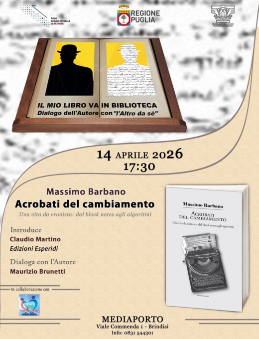 OGGI, Martedì 14 aprile 2026 alle ore 17.30, presso il MediaPorto di Brindisi (Viale Commenda 1) si svolgerà la presentazione del saggio del giornalista Massimo Barbano, dal titolo "Acrobati del cambiamento. Una vita da cronista: dal block notes agli algoritmi", edito da Edizioni Esperidi. Introduce la serata l'editoreClaudio Martino, a dialogare con l'autore sarà Maurizio Brunetti. L'evento è organizzato da MediaPorto nella rassegna culturale "Il mio libro va in Biblioteca. Dialogo dell'Autore con l'altro sé" del Polo BiblioMuseale di Brindisi in collaborazione con ass. Verità e Libertà.Info 0831 544301 / 389 566 1849