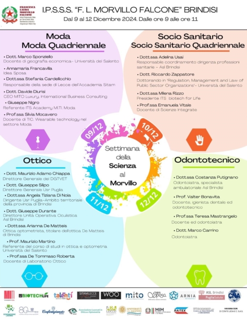Torna la "Settimana della Scienza" per la sua terza edizione dal 9 al 12 dicembre 2024. Quattro giornate interamente dedicate al mondo della scienza e agli indirizzi di studio. Il Morvillo Falcone vanta, tra le uniche 3 scuole su territorio nazionale, dell’innovativa formula del 4+2Alla settimana della scienza parteciperanno esperti del mondo accademico dell’Università del Salento ( Prof. Maurizio Martino, Referente del corso di studi in Ottica e Optometria, Dott. Marco Sponziello, docente di Geografia Economica e Dott. Riccardo Zappatore, Dottorando in “Regulation Management and Law of Public Sector Organizations”) esperti inviati da ASL Brindisi (Dott.ssa Adelina Usai, Responsabile Coordinamento Dirigenza Professioni Sanitarie e Dott. Giuseppe Durante, Direttore Unità Operativa Oculistica e Dott.ssa Costanza Putignano, Odontoiatra specialista ambulatoriale) esperti ITS (Dott. Giuseppe Nigro per MITI e Dott.ssa Milena Rizzo per Biotech For Life), operatori del settore (Dott.ssa Stefania Cardellicchio, Responsabile sede di Lecce Accademia Sitam, Dott. Davide Diurisi, CEO MITO, Luxury International Business Consulting, Dott. Antonio Caliolo, medico dentista, Dott. Marco Carrino, Odontoiatra, Dott.ssa Arianna De Matteis, titolare dell’ottica De Matteis e Annamaria Francavilla per Idea Sposa) e docenti del Morvillo Falcone ( Proff. Silvia Mocavero, Emanuela Vitale, Roberta De Tommaso, Teresa Mastrangelo e Valter Bonavita)