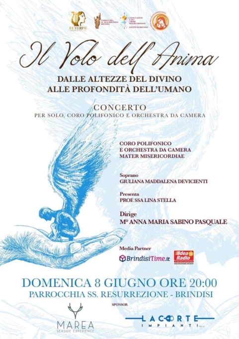 Per celebrare la propria nascita, Euterpe APS presenta il suo primo grande evento: “Il Volo dell’Anima – Dalle altezze del divino alle profondità dell’umano”, un concerto per soprano, coro polifonico e orchestra da camera che si terrà domenica 8 giugno alle ore 20:00, presso la Parrocchia SS. Resurrezione di Brindisi.
