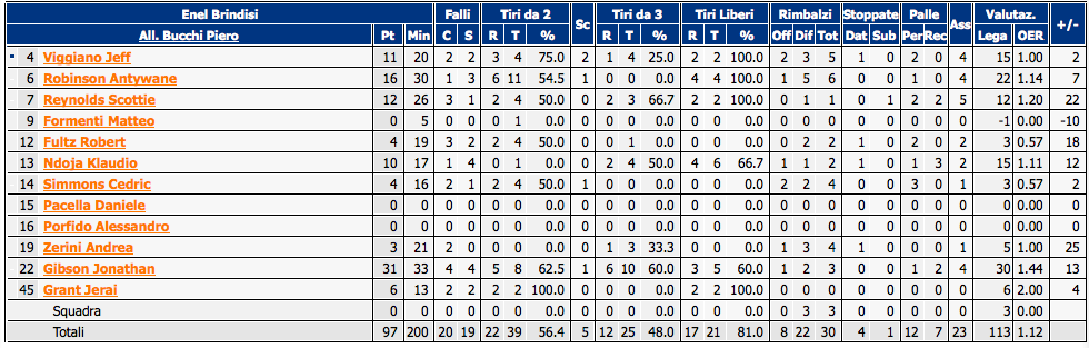 I marchigiani hanno tentato di ribattere colpo su colpo fino al 28° minuto di gioco, poi hanno dovuto issare bandiera bianca contro un Gibson incredibile. Per l'esterno 31 punti in 33 minuti con 5/8 da due, 6/10 da tre, 4 assist e 30 di valutazione. Bene anche Antywane Robinson, autore di 16 punti con 22 di valutazione. L'Enel ha tirato con il 48% di realizzazione da oltre l'arco dei 6.75 m ed ha distribuito la bellezza di 23 assist.