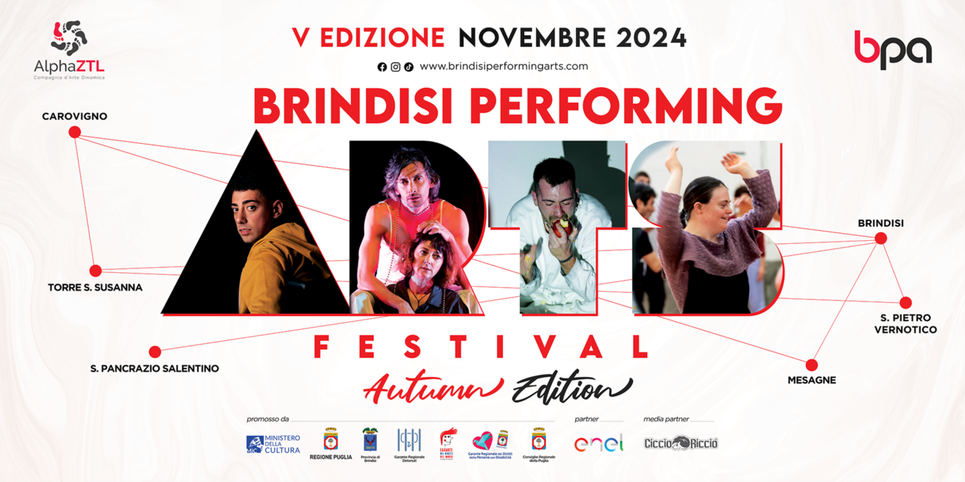 Brindisi Performing Arts (BPA) è organizzato da AlphaZTL Compagnia d’Arte Dinamica, con il contributo di Ministero della Cultura, Regione Puglia, Comune di Brindisi, Comune di Carovigno, Comune di Mesagne, Comune di San Pancrazio Salentino, Comune di Torre Santa Susanna e Comune di San Pietro, Garante delle Persone sottoposte a misure restrittive della libertà personale, Garante Regionale dei Diritti delle Persone con Disabilità, Garante dei Diritti del Minore del Consiglio Regionale della Puglia. In collaborazione con il Ministero della Giustizia e la Casa Circondariale di Brindisi. Media partner Ciccio Riccio.