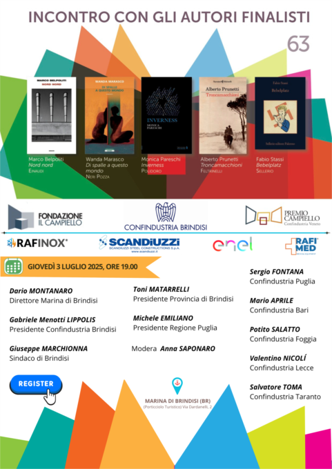 Il tour letterario estivo degli scrittori finalisti del Premio Campiello, concorso di narrativa italiana contemporanea organizzato dalla Fondazione Il Campiello - Confindustria Veneto, arriva in Puglia. Anche quest'anno la tappa si terrà a Brindisi. Giovedì 3 luglio i finalisti della 63^ edizione del Premio saranno - alle ore 19:00, presso il Porticciolo Turistico - grazie alla collaborazione con Confindustria Brindisi.Lettori e appassionati potranno ascoltare gli autori che presenteranno le loro opere, selezionate lo scorso 30 maggio a Padova: Marco Belpoliti con "Nord Nord" (Giulio Einaudi Editore), Wanda Marasco con "Di spalle a questo mondo" (Neri Pozza), Monica Pareschi con "Inverness" (Polidoro), Alberto Prunetti con "Troncamacchioni" (Giangiacomo Feltrinelli Editore) e Fabio Stassi con "Bebelplatz" (Sellerio Editore).