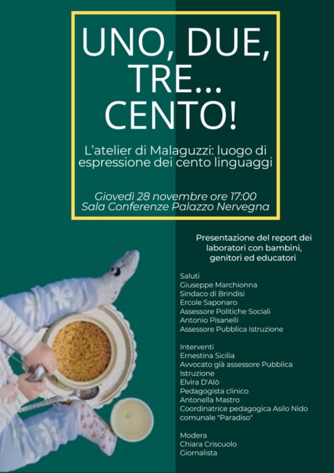 Giovedì 28 novembre, ore 17.00, presso la sala Conferenze di Palazzo Nervegna viene presentato il Report Uno, due, tre … cento! L’atelier di Malaguzzi: luogo di espressione dei cento linguaggi, preziosa raccolta di riflessioni elaborate durante gli incontri laboratoriali con bambini, genitori ed Educatori dell’Asilo Nido comunale Paradiso.Già da alcuni anni il Gruppo Educativo, coordinato dalla dott.ssa Antonella Mastro, con il sostegno di Elvira D’Alò, pedagogista clinico, propone ai genitori percorsi formativi collegati alla Progettazione educativo-didattica pensata e messa in atto per accompagnare mamme e papà nel “difficile” compito di essere genitori e per realizzare la mission del sostegno alla genitorialità che supera forme di semplice accudimento e affiancamento dei piccoli affidati al Nido.