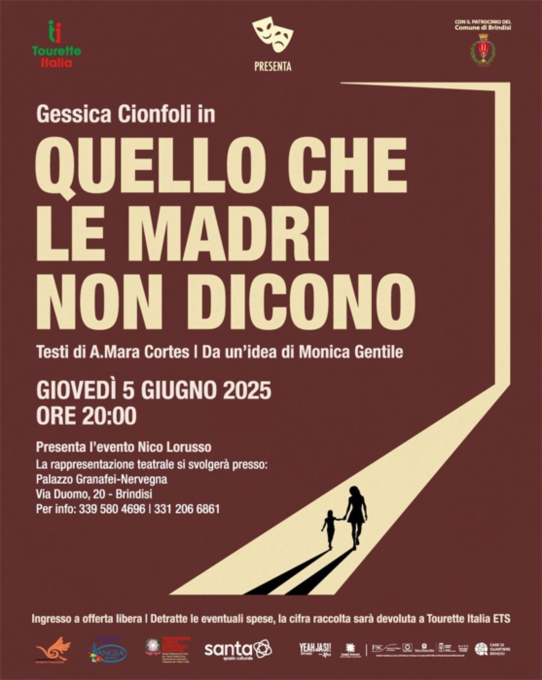 Quando l'arte interpretativa dà voce all'invisibile, una serata per accendere i riflettori sulla Sindrome di Tourette. L'associazione Tourette Italia ETS convoca per il prossimo 30 Maggio alle ore 17:00, presso l'auditorium dell'ex convento Santa Chiara di Brindisi, la conferenza stampa di presentazione della rappresentazione teatrale patrocinata del Comune di Brindisi. "Quello che le madri non dicono", un monologo toccante e profondo, che contribuirà a fare luce sull'esistenza di una condizione troppo a lungo ignorata e sotto-diagnosticata.