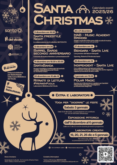 Il Santa Spazio Culturale e la Biblioteca del Vicolo presentano Santa Christmas 2025/26, una rassegna di eventi, incontri, spettacoli e laboratori che accompagneranno la città di Brindisi durante tutto il periodo natalizio.