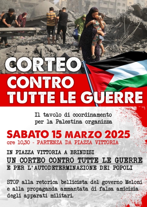 Comunicato del Tavolo di coordinamento per la PALESTINA Nel pomeriggio di ieri,martedì 12 Marzo, presso il MediaPorto di Brindisi si è riunito il Tavolo di coordinamento per la Palestina. Un'occasione per confrontarsi e dibattere sui tragici eventi che dilaniano il medioriente e l'est europeo, e sul bisogno di mettervi fine con piani di Pace & Giustizia che si sta cercando in tutti i modi di boicottare.Dopo ampia discussione i partecipanti alla riunione hanno deciso di svolgere un corteo sabato 15 Marzo con partenza alle 10,30 “contro le guerre,contro il riarmo,per la Palestina “,con partenza da Piazza Vittoria, Brindisi