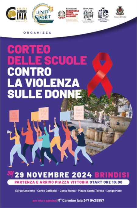 La settimana successiva, venerdì 29 novembre 2024 a partire dalle ore 10:00, previsto il coinvolgimento collettivo attraverso la partecipazione ad un corteo delle scuole che attraverserà le strade del centro storico di Brindisi tramite un percorso in programma per con un momento di condivisione finale di interventi istituzionali e delle scuole partecipanti organizzato, con il patrocinio del Comune di Brindisi, dal m° Carmine Iaia per l'ASCR "Uniti per lo sport" con la collaborazione nella fase organizzativa dell'IPSSS "Laura Francesca Morvillo Falcone" di Brindisi della Dirigente Irene Esposito che farà da capofila per il coinvolgimento di altre scuole di ogni ordine e grado del Capoluogo Adriatico e della sua provincia. La partecipazione, allargata ad Associazioni, Enti, Gruppi organizzati e all'intera cittadinanza, sarà l'occasione per unirsi a gridare forte "Basta!!!" a minacce, soprusi, atti di violenza e costrizioni che provocano sofferenza fisica, sessuale o psicologica di cui spesso molte donne, purtroppo, sono vittime.