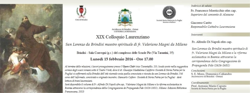 Al termine delle relazioni, i lavori proseguiranno presso l'Open Club (vico Tarantafilo, 10), locale posto nella suggestiva cornice degli scavi romani sotto il Teatro Verdi, dove il dr. Giuseppe Maddalena Capiferro (Società di Storia Patria per la Puglia) si soffermerà sulla Brindisi dell'età vicereale ossia quella conosciuta e vissuta da san Lorenzo da Brindisi. Nel corso dell'informale, conviviale e originale incontro, Giancarlo Cafiero (Società di Storia Patria per la Puglia) darà lettura di brani laurenziani.