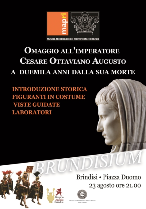 Sabato 23 agosto 2014, ore 21.00 - Museo Archeologico Provinciale Brindisi MapriAll'interno del museo provinciale, nella sala dedicata al porto, si terrà un incontro tematico dal titolo "Cesare Ottaviano Augusto, il primo imperatore di Roma", in occasione del bimillenario della sua morte. L'evento prevede la presenza di figuranti in abito romano e lo svolgimento di laboratori didattici e visite guidate tematiche sulla Brundisium romana.