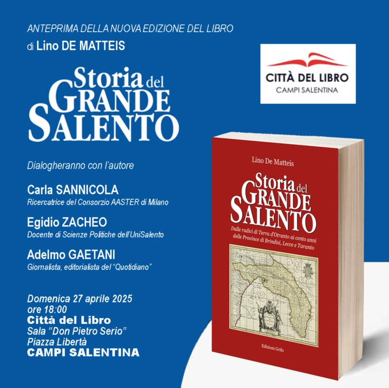 "Storia del Grande Salento", la nuova edizione presentata in anteprima alla Città del Libro di Campi SalentinaLa nuova edizione del libro di Lino De Matteis "Storia del Grande Salento" (Edizioni Grifo) sarà presentata in anteprima alla XXIV edizione della "Città del Libro" di Campi Salentina, domenica 27 aprile 2025, alle ore 18:00, nella Sala "Don Pietro Serio", in piazza Libertà. Dialogheranno con l'autore Carla Sannicola, ricercatrice sociale del Consorzio AASTER di Milano, Egidio Zacheo, docente di Scienze politiche all'Università del Salento, e Adelmo Gaetani, giornalista ed editorialista del "Nuovo Quotidiano di Puglia". Il successo della prima edizione ha spinto l'editore a questo ulteriore impegno, per riportare in libreria il volume implementato nei contenuti, con una nuova copertina e una veste grafica più pertinente e adatta anche ai giovani lettori salentini e al mondo della scuola in generale.