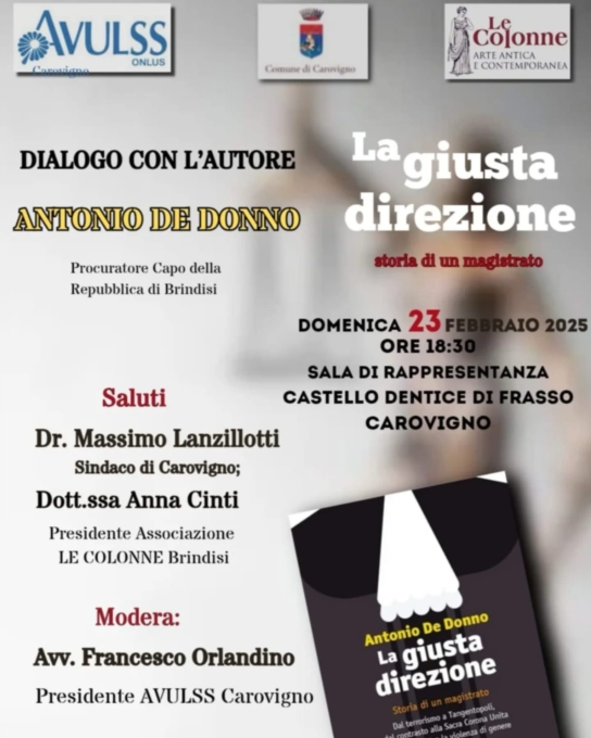 Dialogherà con l’autore l’avvocato Francesco Orlandino, presidente dell’AVULSS di Carovigno.