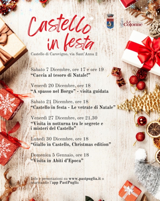 Il Castello di Carovigno in festa, ecco il calendario delle prossime iniziativeIn occasione delle festività natalizie, dal 7 dicembre al 6 gennaio, presso il Castello di Carovigno, va in scena un ricco calendario dal titolo “Castello in Festa”, promosso e coordinato dall’ente gestore Le Colonne.