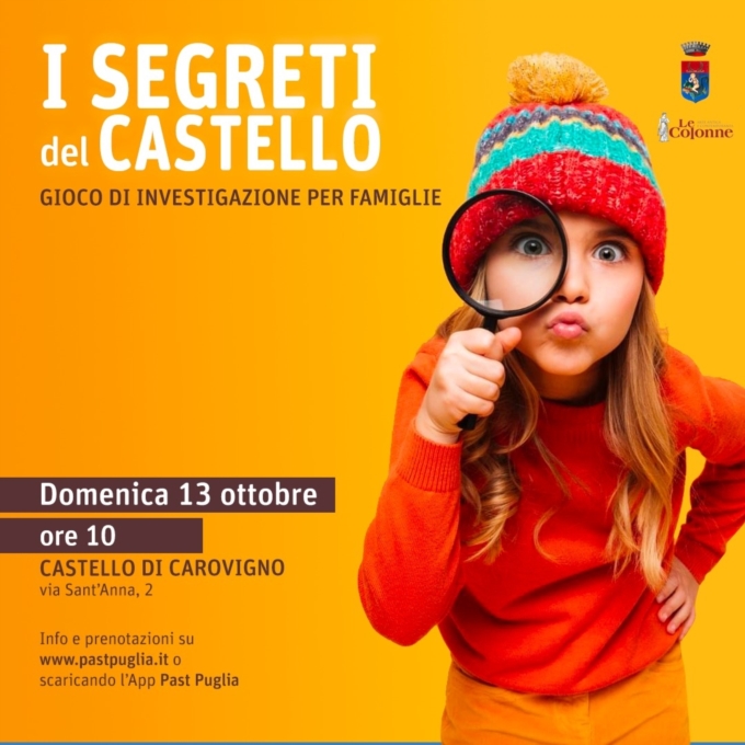 “I segreti del Castello”, un nuovo gioco per famiglie al Castello Dentice di Frasso di Carovigno Domenica 13 ottobre, alle ore 10 presso il Castello Dentice di Frasso di Carovigno si terrà “I segreti del Castello”, un gioco di investigazione per famiglie.