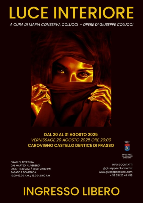 Dal 20 al 31 agosto 2025, il Castello Dentice di Frasso di Carovigno, ospiterà Luce Interiore, mostra a cura di Maria Conserva Colucci dedicata alle opere di Giuseppe Colucci, artista pugliese, originario di Ostuni, celebrato per la sua capacità di trasformare il corpo femminile in un racconto onirico e sensuale. La mostra si svolgerà ad un anno dalla scomparsa dell'autore avvenuta il 20 agosto 2024 a Carovigno, città in cui Colucci risiedeva da anni.La mostra, a ingresso libero, sarà aperta dal martedì al venerdì (09:30-12:30 / 18:00-22:00) e nei weekend (10:00-13:00 / 18:00-21:00). Il vernissage è previsto per il 20 agosto alle ore 20:00.